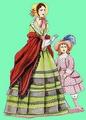 Девочка одета в платье с облегающим лифом, дополненным короткой баской, Это платье тоже имеет колоколообразные рукава, из-под которых выступают нижние рукава. Юбка до колена длиной украшена оборками; выглядывающие из-под юбки панталончики кончаются как раз под коленом.